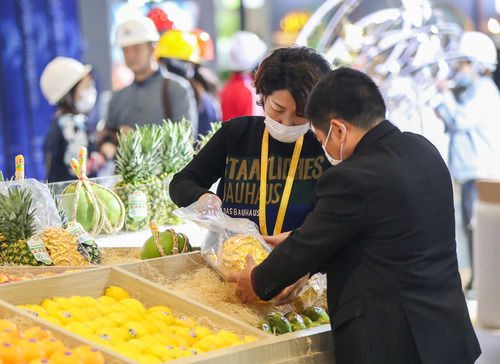 11月2日,在食品及農(nóng)產(chǎn)品展區(qū),一企業(yè)展臺的工作人員在擺放展品。連日來,第三屆中國國際進(jìn)口博覽會舉辦地國家會展中心(上海)內(nèi)一派忙碌景象,各個展館的搭建和布置工作正有條不紊地進(jìn)行。新華社記者 丁汀 攝