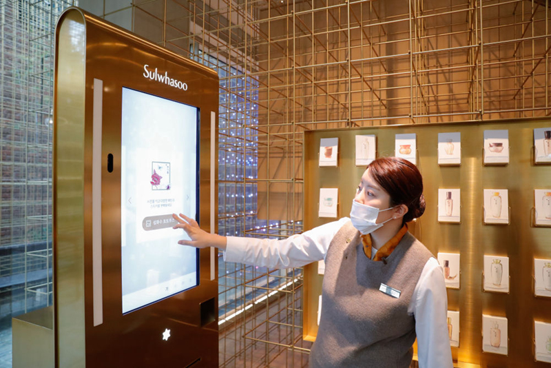 10月27日,工作人員在位于韓國首爾江南區(qū)的愛茉莉太平洋雪花秀旗艦店內(nèi)指導(dǎo)客人體驗店內(nèi)設(shè)施??偛课挥陧n國首爾的美妝企業(yè)愛茉莉太平洋集團(tuán)今年將連續(xù)第三次參加進(jìn)博會。新華社記者 王婧嬙 攝
