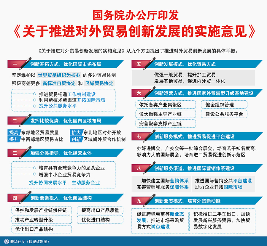 一是創(chuàng)新開拓方式,優(yōu)化國際市場布局。堅(jiān)定維護(hù)以世界貿(mào)易組織為核心的多邊貿(mào)易體制,積極商簽更多高標(biāo)準(zhǔn)自貿(mào)協(xié)定和區(qū)域貿(mào)易協(xié)定。推進(jìn)貿(mào)易暢通工作機(jī)制建設(shè),利用新技術(shù)新渠道開拓國際市場,提升公共服務(wù)水平。二是發(fā)揮比較優(yōu)勢,優(yōu)化國內(nèi)區(qū)域布局。提高東部地區(qū)貿(mào)易質(zhì)量,提升中西部地區(qū)貿(mào)易占比,擴(kuò)大東北地區(qū)對外開放,創(chuàng)新區(qū)域間外貿(mào)合作機(jī)制。三是加強(qiáng)分類指導(dǎo),優(yōu)化經(jīng)營主體。培育具有全球競爭力的龍頭企業(yè),增強(qiáng)中小企業(yè)貿(mào)易競爭力,提升協(xié)同發(fā)展水平,主動服務(wù)企業(yè)。四是創(chuàng)新要素投入,優(yōu)化商品結(jié)構(gòu)。保護(hù)和發(fā)展產(chǎn)業(yè)鏈供應(yīng)鏈,推動產(chǎn)業(yè)轉(zhuǎn)型升級,優(yōu)化出口產(chǎn)品結(jié)構(gòu),提高出口產(chǎn)品質(zhì)量,優(yōu)化進(jìn)口結(jié)構(gòu)。五是創(chuàng)新發(fā)展模式,優(yōu)化貿(mào)易方式。做強(qiáng)一般貿(mào)易,提升加工貿(mào)易,發(fā)展其他貿(mào)易,促進(jìn)內(nèi)外貿(mào)一體化。六是創(chuàng)新運(yùn)營方式,推進(jìn)國家外貿(mào)轉(zhuǎn)型升級基地建設(shè)。依托各類產(chǎn)業(yè)集聚區(qū),做大做強(qiáng)主導(dǎo)產(chǎn)業(yè)鏈,完善配套支撐產(chǎn)業(yè)鏈,健全組織管理,建設(shè)公共服務(wù)平臺。七是創(chuàng)新服務(wù)模式,推進(jìn)貿(mào)易促進(jìn)平臺建設(shè)。辦好進(jìn)博會、廣交會等一批綜合展會,培育若干知名度高、影響力大的國際展會。培育進(jìn)口貿(mào)易促進(jìn)創(chuàng)新示范區(qū)。八是創(chuàng)新服務(wù)渠道,推進(jìn)國際營銷體系建設(shè)。加快建立國際營銷體系,完善營銷和服務(wù)保障體系。推進(jìn)國際營銷公共平臺建設(shè),助力企業(yè)開拓國際市場。九是創(chuàng)新業(yè)態(tài)模式,培育外貿(mào)新動能。促進(jìn)跨境電商等新業(yè)態(tài)發(fā)展,推進(jìn)市場采購貿(mào)易方式試點(diǎn)建設(shè)。積極推進(jìn)二手車出口,加快發(fā)展新興服務(wù)貿(mào)易,加快貿(mào)易數(shù)字化發(fā)展。