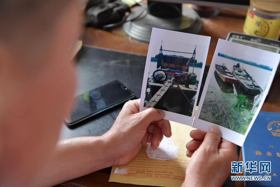 在江西省南昌市新建區(qū)象山鎮(zhèn),上岸漁民吳華山在展示自己珍藏的兩張漁船的照片。這兩條船是吳華山還在當(dāng)漁民時(shí)使用的捕撈船只,上岸轉(zhuǎn)業(yè)之后,船只上交,他用領(lǐng)到的補(bǔ)貼開(kāi)始承包魚(yú)塘養(yǎng)殖小龍蝦(6月5日攝)。新華社記者 彭昭之 攝