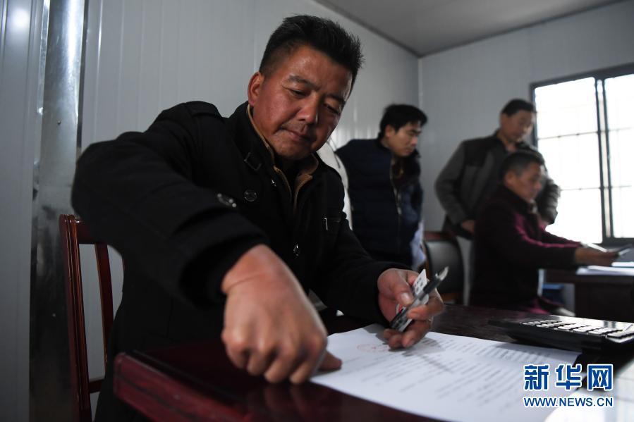 在湖南常德漢壽縣蔣家嘴鎮(zhèn),一名過(guò)去在洞庭湖捕魚(yú)的漁民在漢壽縣捕撈漁民退捕協(xié)議書(shū)上按下手?。?019年12月17日攝)。新華社記者 薛宇舸 攝