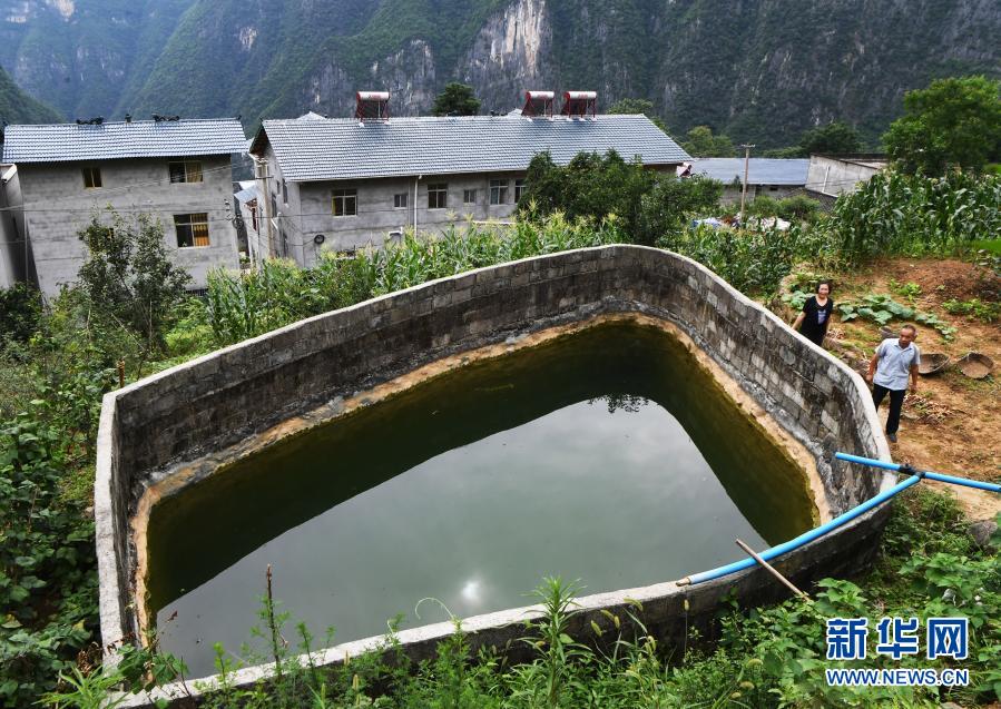 毛相林(前)經(jīng)過(guò)下莊村用于農(nóng)業(yè)生產(chǎn)的水池(2020年7月3日攝)。