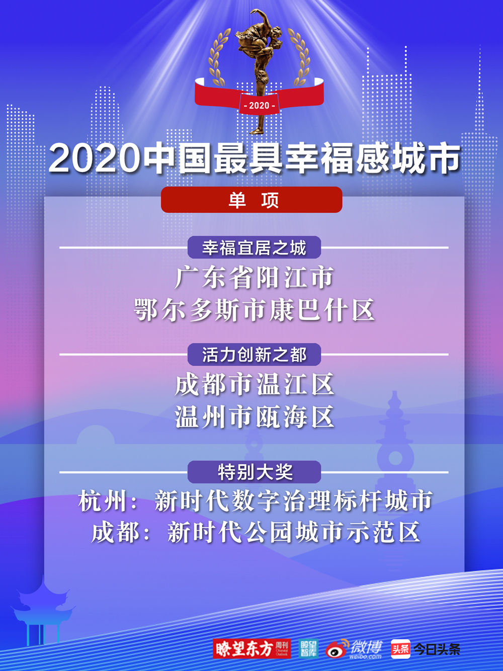 鑒于成都和杭州在城市治理方面的突出成就,組委會(huì)特別授予成都“新時(shí)代公園城市示范區(qū)”稱號(hào)、杭州 “新時(shí)代數(shù)字治理標(biāo)桿城市”稱號(hào)。另外,根據(jù)材料申報(bào)和大數(shù)據(jù)單項(xiàng)調(diào)查,廣東省陽(yáng)江市、鄂爾多斯市康巴什區(qū)被評(píng)為“幸福宜居之城”,成都市溫江區(qū)、溫州市甌海區(qū)被評(píng)為“活力創(chuàng)新之都”。