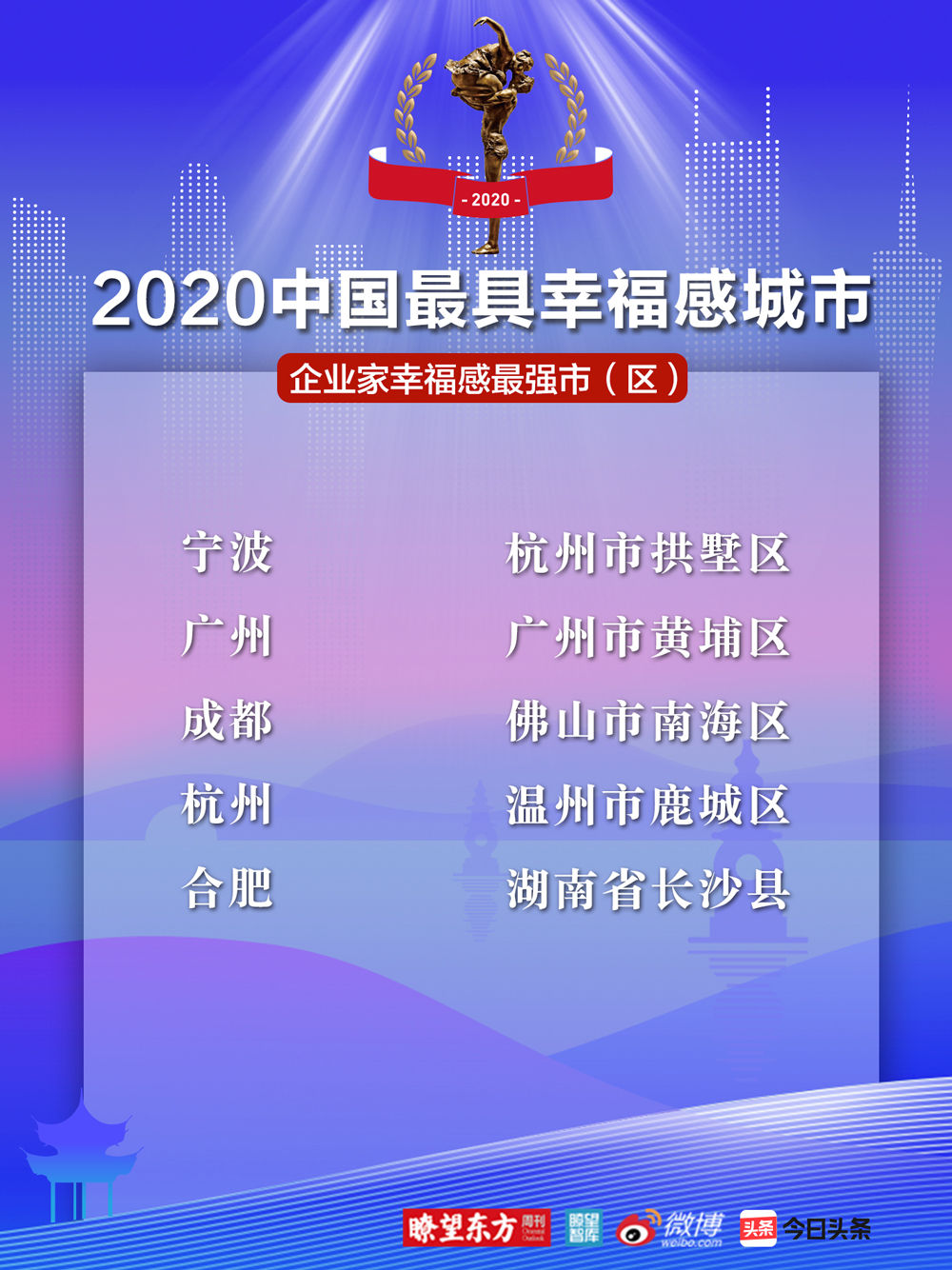 根據(jù)主觀調(diào)查問(wèn)卷對(duì)企業(yè)主(家)幸福感的調(diào)查結(jié)果,組委會(huì)評(píng)選寧波、廣州、成都、杭州、合肥、杭州市拱墅區(qū)、廣州市黃埔區(qū)、佛山市南海區(qū)、溫州市鹿城區(qū)、湖南省長(zhǎng)沙縣為“企業(yè)家幸福感最強(qiáng)市(區(qū))”。