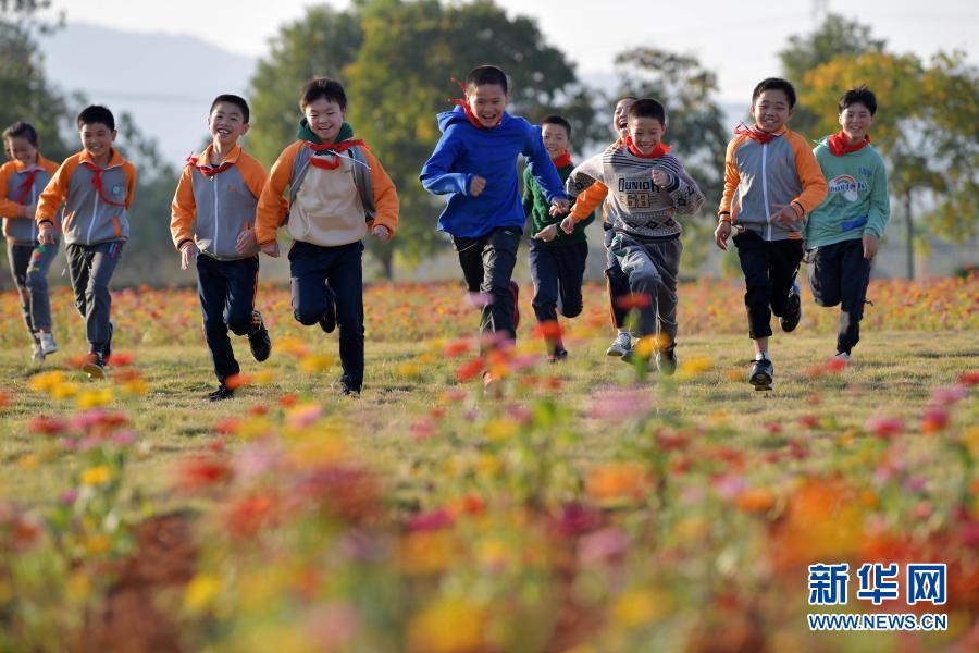 在江西省宜春市袁州區(qū)寨下中心小學,學生們在花田邊玩耍(11月9日攝)。新華社記者 彭昭之 攝