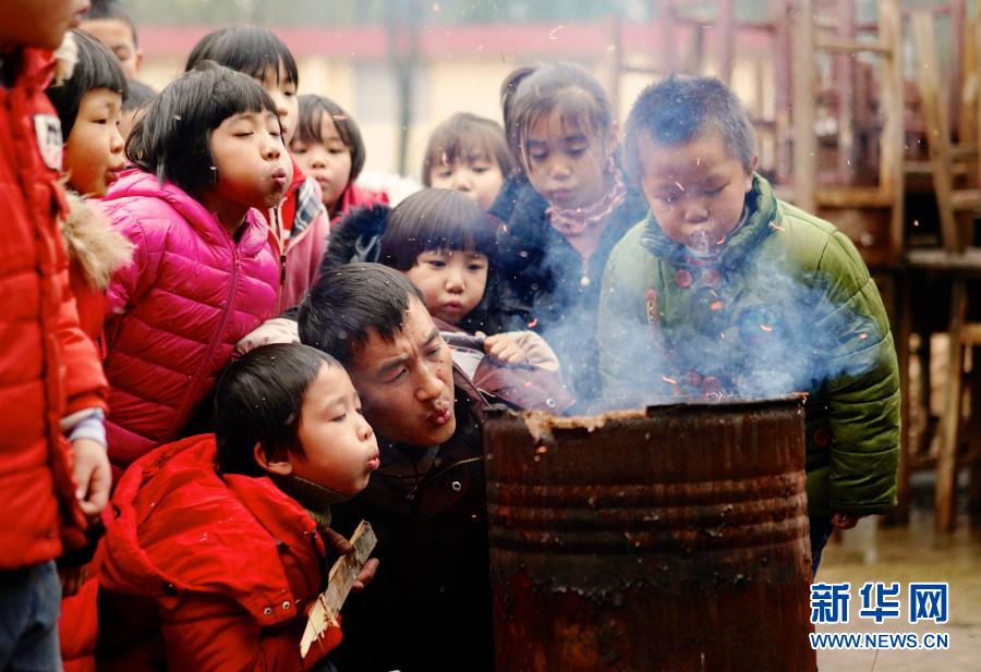 在江西省鷹潭市余江區(qū)春濤鎮(zhèn)黃泥村黃泥小學,老師章站亮(前右)和學生們一起生火(2019年1月3日攝)。由于生火用的材料均是廢棄的桌椅或者枯葉,點火后得不停用嘴吹氣才能燒得旺盛。新華社記者 胡晨歡 攝