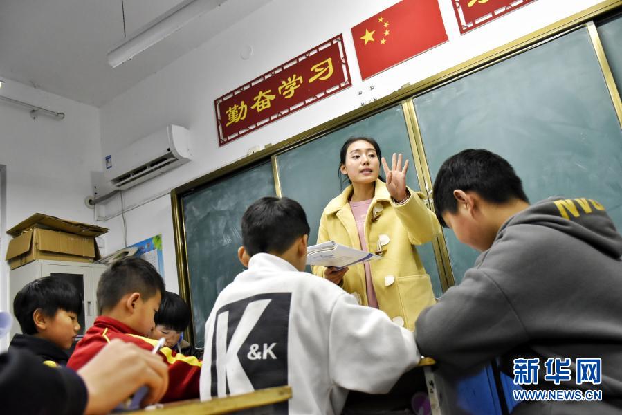 11月17日晚,在河南省洛陽(yáng)市嵩縣德亭鎮(zhèn)酒店小學(xué),王予川給寄宿小學(xué)生輔導(dǎo)功課。新華社記者 韓朝陽(yáng) 攝