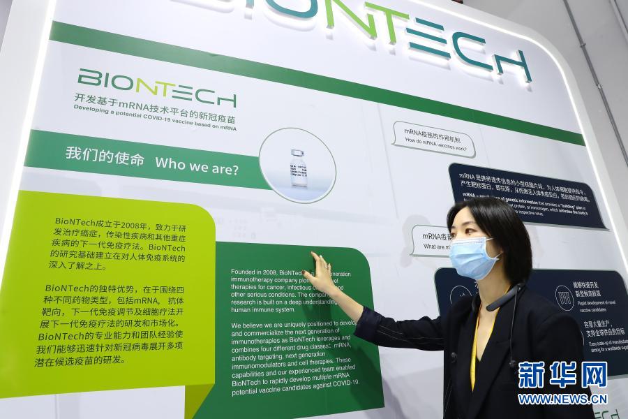 11月5日,在第三屆中國(guó)國(guó)際進(jìn)口博覽會(huì)上,工作人員在醫(yī)療器械及醫(yī)藥健康展區(qū)介紹由復(fù)星醫(yī)藥與德國(guó)拜恩泰科合作開(kāi)發(fā)的新冠病毒mRNA(信使核糖核酸)疫苗。新華社記者 張玉薇 攝