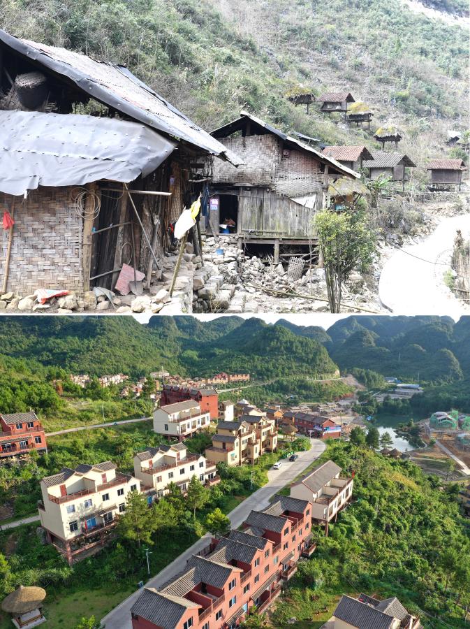上圖為整屯搬遷前的廣西南丹縣里湖瑤族鄉(xiāng)董甲村么干屯(2018年1月10日攝),下圖為當(dāng)?shù)卮迕癜徇w后所在的“千家瑤寨·萬戶瑤鄉(xiāng)”里湖王尚易地扶貧搬遷安置點(8月4日攝,無人機照片)。新華社記者 周華 攝