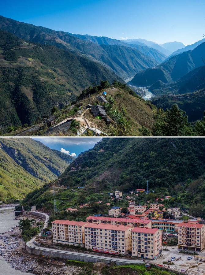 上圖是云南省福貢縣匹河怒族鄉(xiāng)托坪村一景(2016年11月25日攝);下圖是搬遷到怒江邊的托坪村五湖易地扶貧搬遷安置點新村(11月3日攝,無人機照片)。新華社記者 胡超 攝