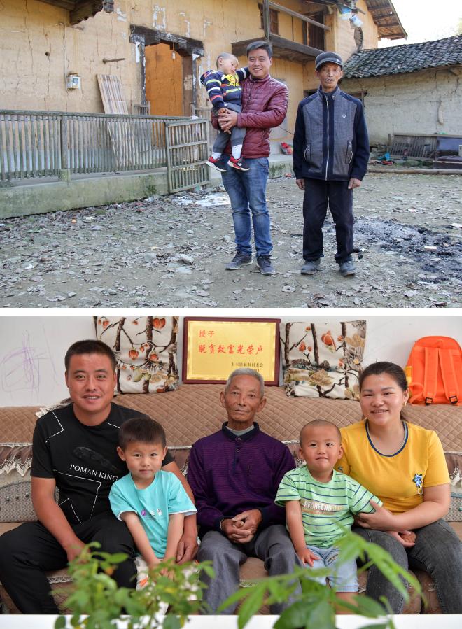 上圖:在江西,村民胡尚海抱著兒子和父親在舊屋前合影(2017年11月攝,資料照片)。下圖:胡尚海一家在安置點的住房內(nèi)合影(5月21日攝,新華社記者 彭昭之 攝)