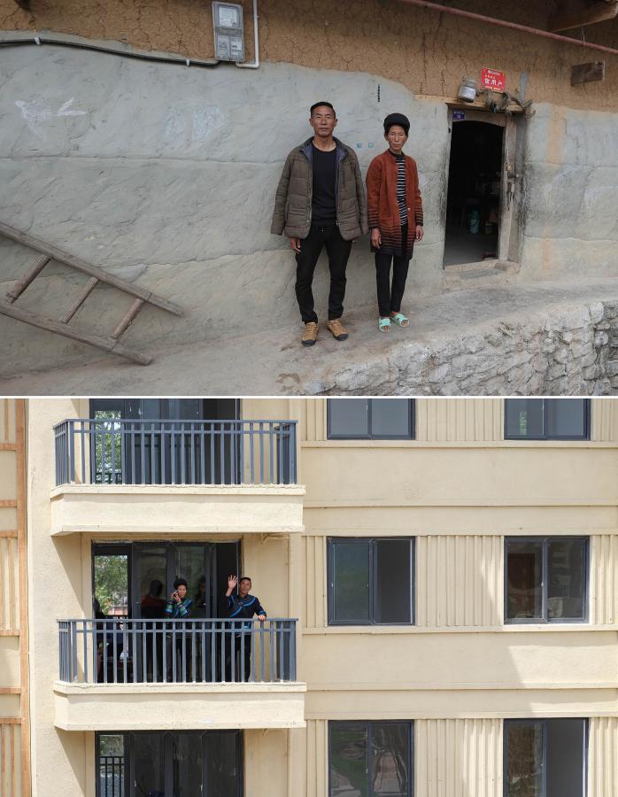 上圖為四川省昭覺縣阿土列爾村村民某色達(dá)體夫婦在“懸崖村”的家門口拍照留念(5月13日攝);下圖為某色達(dá)體夫婦在昭覺縣城易地扶貧搬遷安置點南坪社區(qū)新家的陽臺上揮手(5月13日攝)。新華社記者 江宏景 攝
