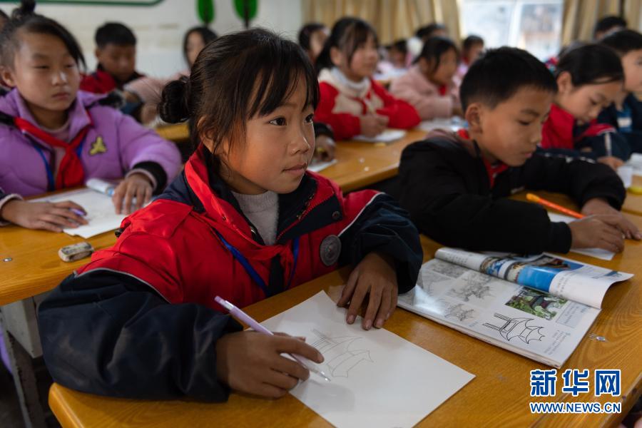 云南省鎮(zhèn)雄縣以古鎮(zhèn)巖洞腳九年一貫制學(xué)校的孩子們在上課(11月11日攝)。新華社記者 王冠森 攝