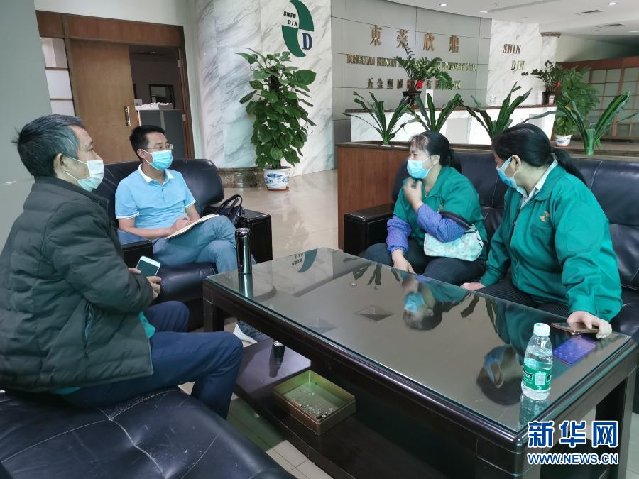 鎮(zhèn)雄縣駐廣東省東莞市清溪鎮(zhèn)勞務(wù)輸出工作站站長張勇(左二)在清溪鎮(zhèn)一家企業(yè)走訪鎮(zhèn)雄籍務(wù)工人員(4月24日攝)。新華社發(fā)