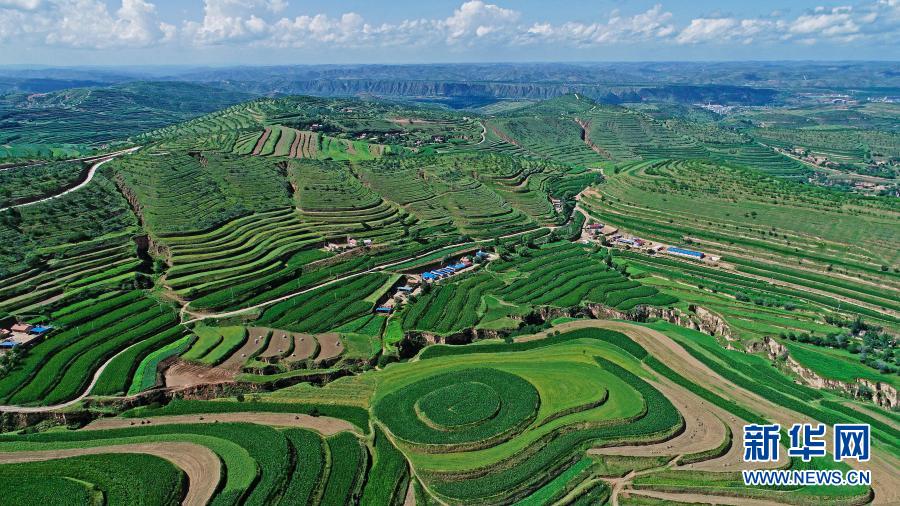 這是2018年7月16日拍攝的寧夏彭陽縣金雞坪梯田公園(無人機照片)。新華社記者 王鵬 攝