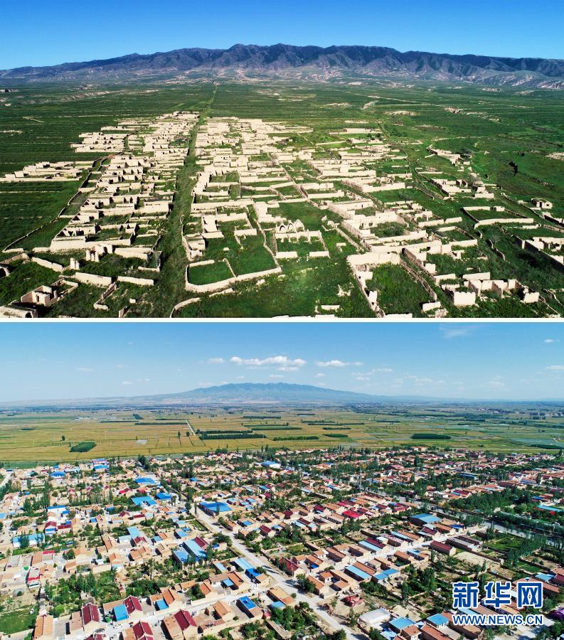 這是一張拼版照片,上圖為:經(jīng)過多年的生態(tài)修復,寧夏吳忠市紅寺堡區(qū)新莊集鄉(xiāng)的移民舊址已逐漸被綠色覆蓋;下圖為:戈壁荒灘上建起的紅寺堡移民新村(2018年9月8日攝,無人機照片)。新華社記者 王鵬 攝