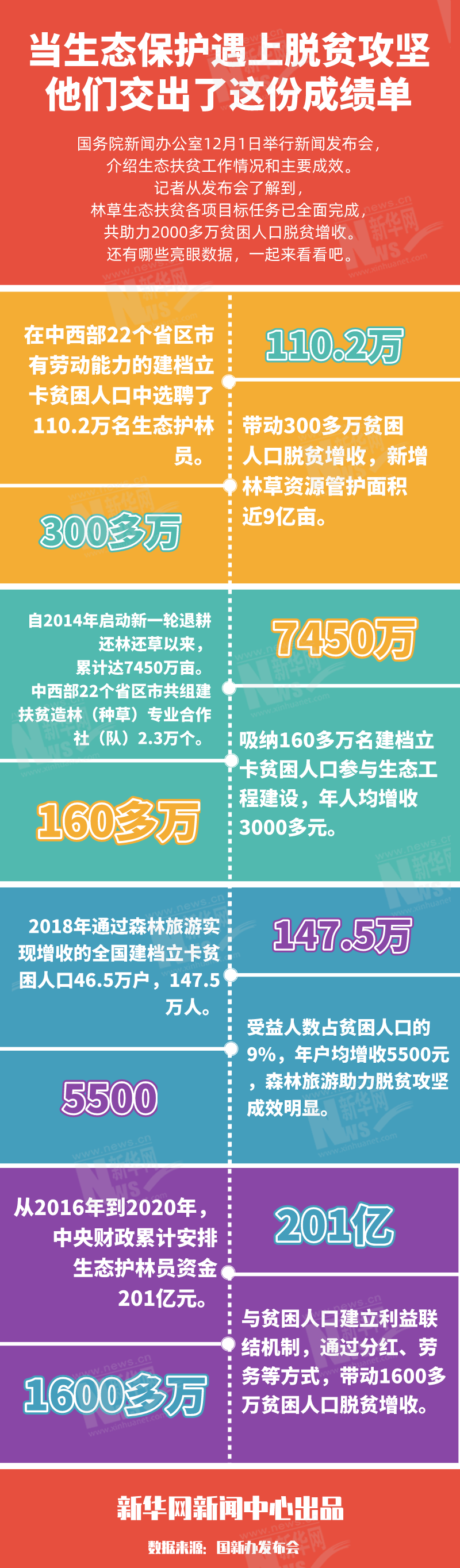 新華網(wǎng)北京12月1日電(汪亞)國務(wù)院新聞辦公室于今日舉行新聞發(fā)布會,介紹生態(tài)扶貧工作情況和主要成效。國家林業(yè)和草原局副局長李春良在發(fā)布會透露,黨的十八大以來,林草生態(tài)扶貧各項目標(biāo)任務(wù)全面完成,在推進(jìn)生態(tài)補(bǔ)償扶貧、推進(jìn)國土綠化扶貧、推進(jìn)生態(tài)產(chǎn)業(yè)扶貧、推進(jìn)定點幫扶縣脫貧摘帽等四大方面發(fā)力,共助力2000多萬貧困人口脫貧增收。