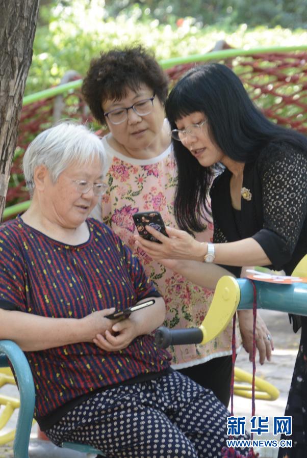 龍澤苑社區(qū)黨支部書記、居委會主任伊然(右)在社區(qū)內(nèi)教老年人使用手機(jī)里的社區(qū)服務(wù)軟件(8月10日攝)。新華社記者 李欣 攝