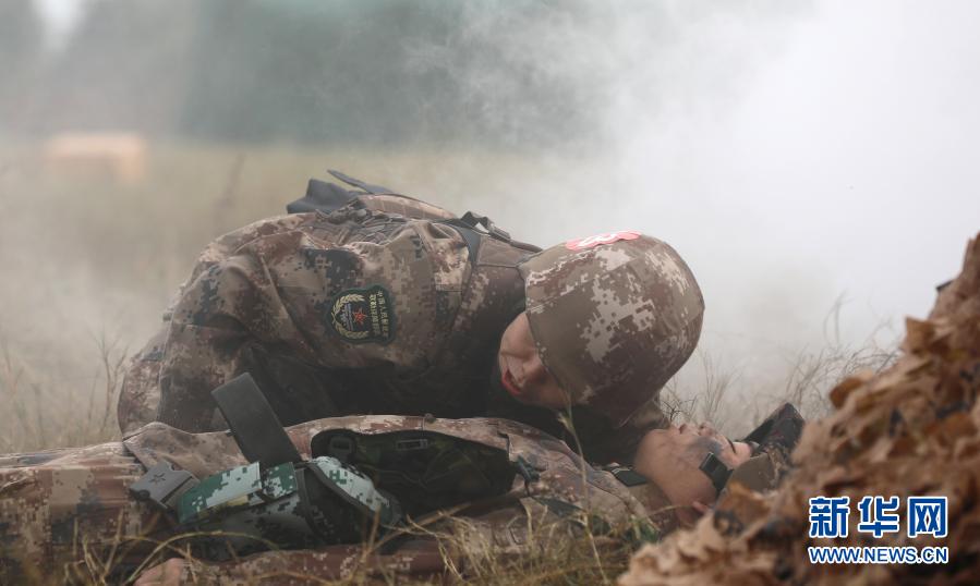 衛(wèi)勤專業(yè)參賽隊員在進(jìn)行戰(zhàn)場“傷員”急救(11月29日攝)。新華社發(fā)(武一明 攝)