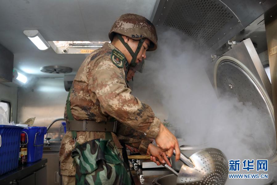 飲食保障隊參賽隊員在野戰(zhàn)炊事車內(nèi)加工制作野戰(zhàn)快餐(11月29日攝)。新華社發(fā)(呂冀周 攝)