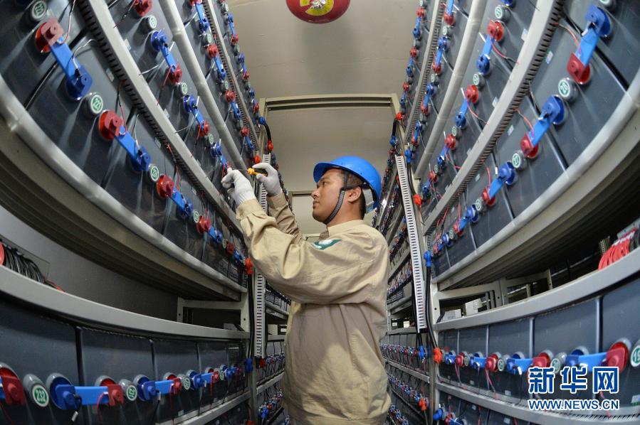 在江蘇省灌云縣開山島,國家電網(wǎng)的施工人員在調(diào)試“風(fēng)光儲互補智能微電網(wǎng)系統(tǒng)”的蓄電池組(2019年6月18日攝)。新華社發(fā)(萬程鵬 攝)