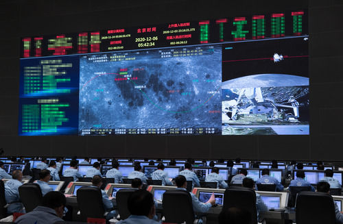 12月6日,航天科技人員在北京航天飛行控制中心指揮大廳監(jiān)測(cè)嫦娥五號(hào)上升器與軌道器返回器組合體交會(huì)對(duì)接情況。新華社記者 金立旺 攝
