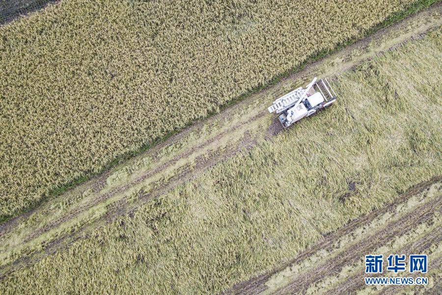 10月22日,工作人員駕駛收割機(jī)在海南??邶埲A區(qū)龍泉鎮(zhèn)新江村收割晚稻(無人機(jī)照片)。