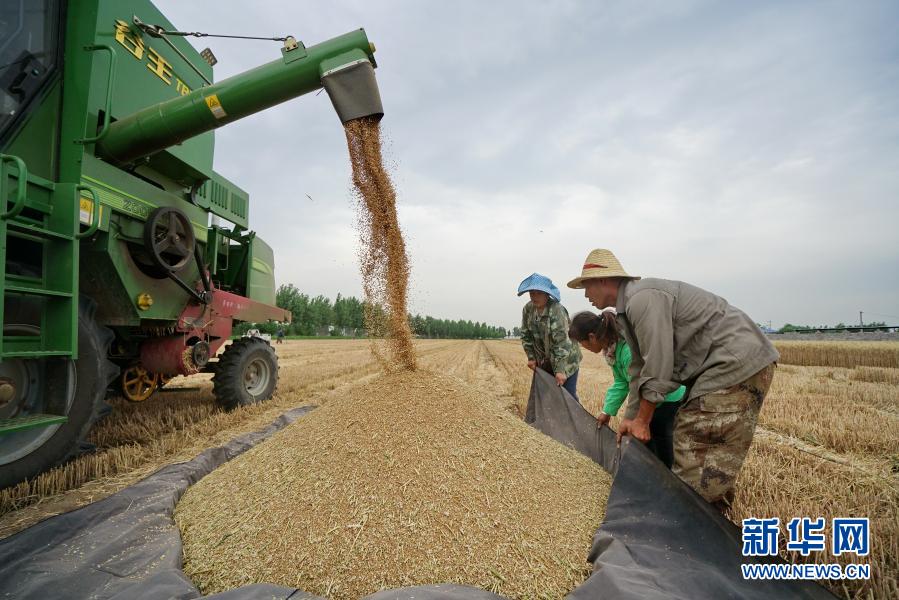 河北省灤州市灤城街道鄒家洼村村民在收獲小麥(6月18日攝)。