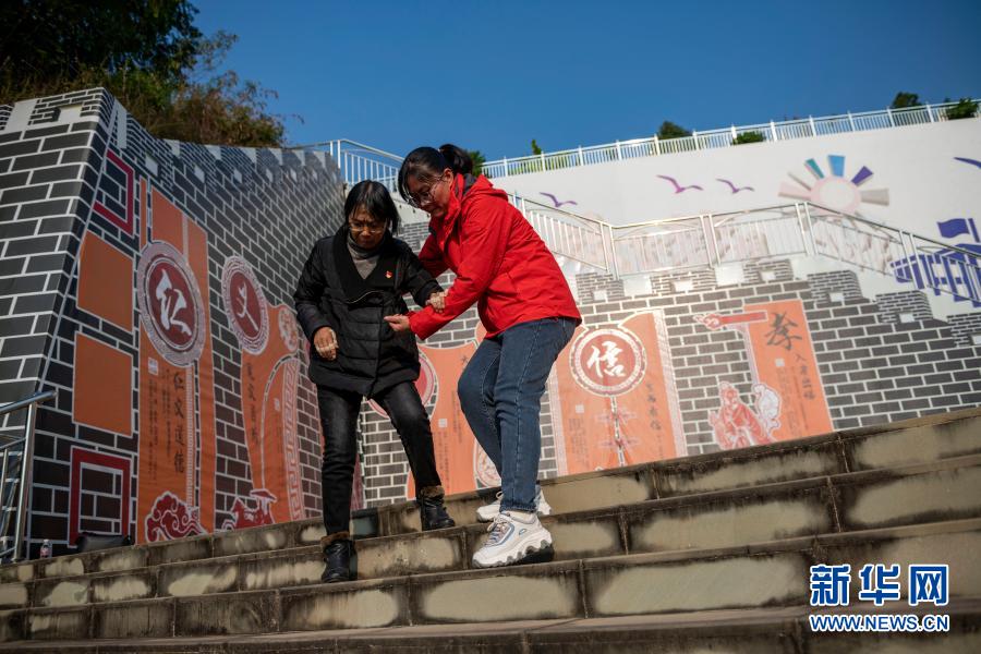 一名老師攙扶張桂梅(左)下臺(tái)階(11月30日攝)。新華社發(fā)(陳欣波 攝)