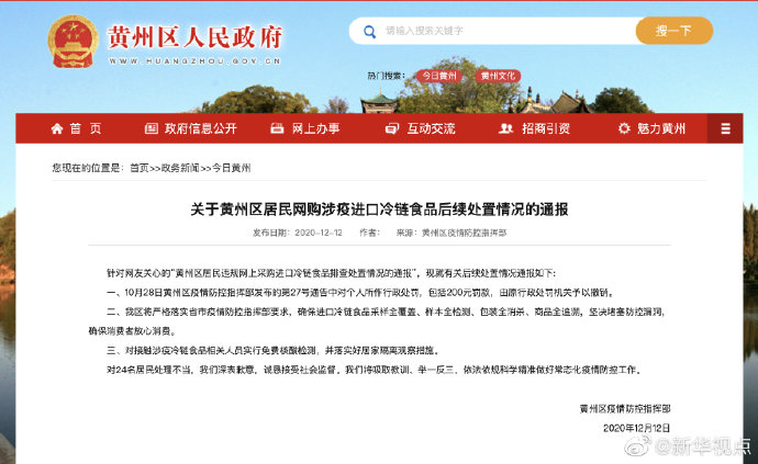 湖北省黃岡市黃州區(qū)人民政府網(wǎng)站12日發(fā)布通報,撤銷對網(wǎng)購涉疫進口冷鏈食品個人所作的行政處罰,包括200元罰款。 ????
