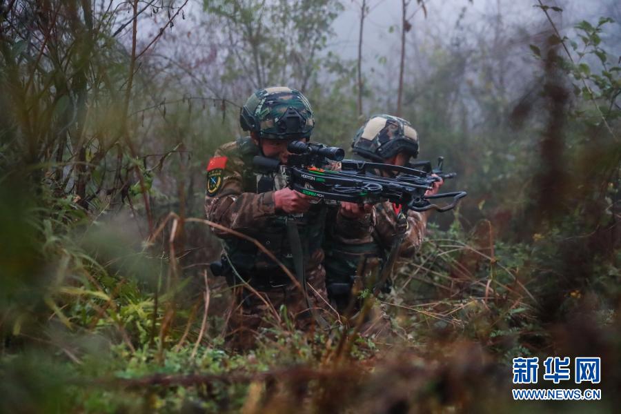 武警貴州總隊六盤水支隊特戰(zhàn)隊員在山林地捕殲戰(zhàn)斗中用弓弩射擊(12月10日攝)。新華社發(fā)(康夫?qū)?攝)
