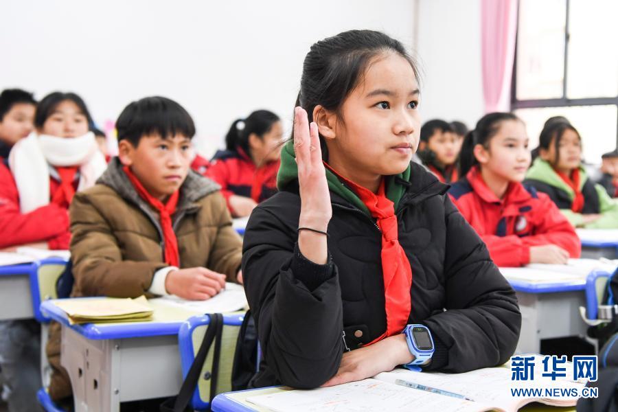 廣西羅城·深圳實(shí)驗(yàn)小學(xué)六年級(jí)學(xué)生潘欣怡(前)在課堂上舉手回答問(wèn)題(12月16日攝)。新華社記者 曹祎銘 攝
