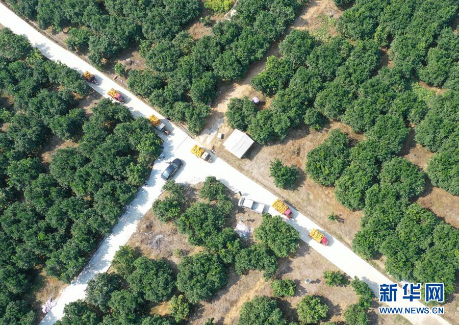 在廣西羅城仫佬族自治縣金玉柚生態(tài)產(chǎn)業(yè)扶貧示范區(qū),裝載柚子的車(chē)輛在柚子園內(nèi)行駛(無(wú)人機(jī)照片,2019年11月5日攝)。新華社記者 陸波岸 攝
