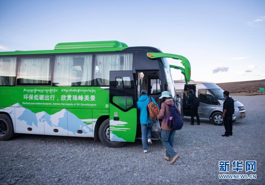 游客在珠穆朗瑪峰景區(qū)停車場轉(zhuǎn)乘環(huán)保客車(2019年5月16日攝)。珠穆朗瑪峰景區(qū)內(nèi)自2019年5月開始試運營清潔能源環(huán)??蛙?,以進一步平衡珠峰地區(qū)旅游發(fā)展與環(huán)境保護需要。新華社記者 孫非 攝