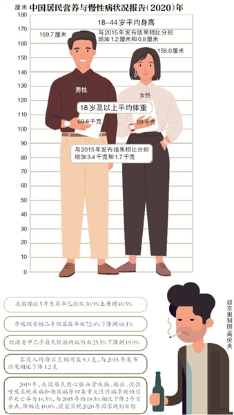 二是居民健康意識逐步增強(qiáng),部分慢性病行為危險(xiǎn)因素流行水平呈現(xiàn)下降趨勢。近年來,居民吸煙率略有下降,非吸煙者的二手煙暴露率由72.4%下降到68.1%。飲酒者中幾乎每天飲酒的比例由25.5%下降到19.9%。家庭人均每日烹調(diào)用鹽9.3克,與2015年發(fā)布結(jié)果相比下降1.2克。居民對自己健康的關(guān)注程度也在不斷提高,定期測量體重、血壓血糖、血脂等健康指標(biāo)的人群比例顯著增加。