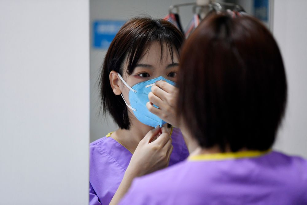 在天津醫(yī)科大學(xué)總醫(yī)院空港醫(yī)院,張碩在戴口罩準(zhǔn)備進(jìn)入“紅區(qū)”工作(12月18日攝)。