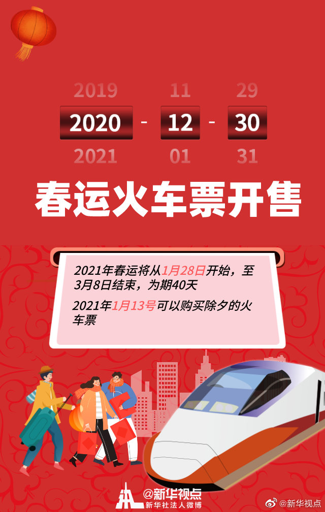 12月30日,2021年春運(yùn)火車票正式開始發(fā)售。2021年春運(yùn)將從1月28日開始,至3月8日結(jié)束,為期40天。不知道你做好出行計(jì)劃了嗎?說到買票,讓小編為你敲重點(diǎn):1月13日前后可以購買除夕前后的火車票;想安安靜靜旅行,你可以選擇靜音車廂;票沒搶到,你可以通過“候補(bǔ)購票”功能試試運(yùn)氣??紤]疫情原因,建議有條件的旅客錯(cuò)峰出行,避開春運(yùn)高峰期,出行時(shí)做好防護(hù)措施,全程佩戴口罩。(記者 樊曦 周圓)