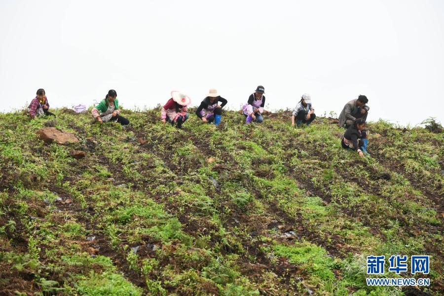 農民在貴州省普安縣地瓜鎮(zhèn)屯上村的“扶貧茶園”里給茶苗除草(2019年7月7日攝)。當?shù)氐牟鑸@栽種有浙江安吉黃杜村捐贈的白茶苗。新華社記者 楊文斌 攝
