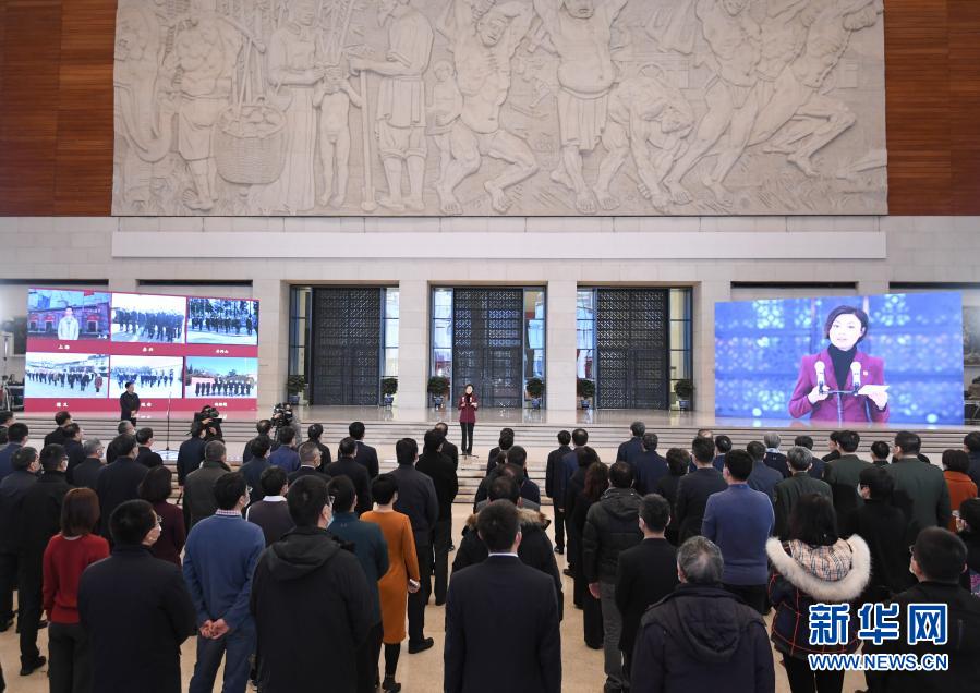 1月18日,在北京國(guó)家博物館,記者代表展示“奮斗百年路 啟航新征程”大型主題采訪活動(dòng)旗幟。新華社記者 申宏 攝