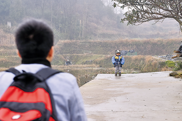 我和同事跟在石欣身后,拐過一道路口,看見不遠(yuǎn)處有個(gè)小小的身影,走在前面的石欣用方言喊了一聲,“家鴻”。正是他在外打工最思念的兒子!本能讓我馬上握緊了手中的相機(jī)。