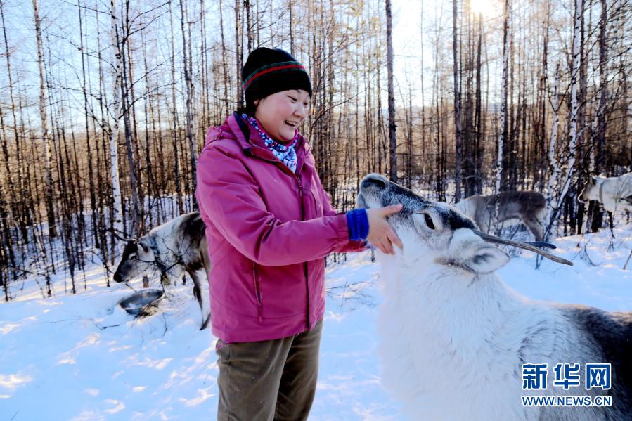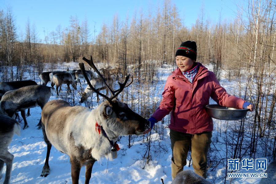 在黑龍江省大興安嶺地區(qū)飛虎山5號線,曹樹權(quán)的妻子姜雪梅正在給馴鹿喂食(2020年11月22日攝)。新華社發(fā)