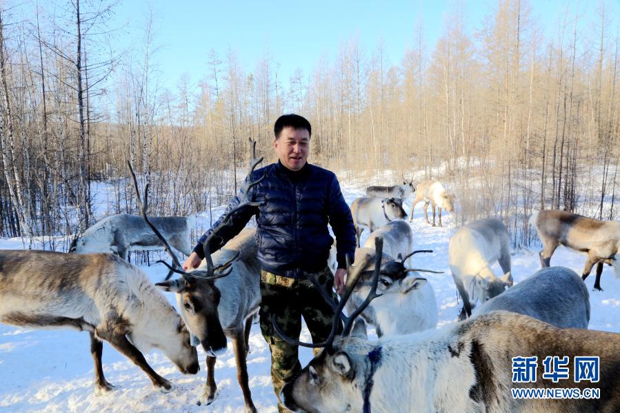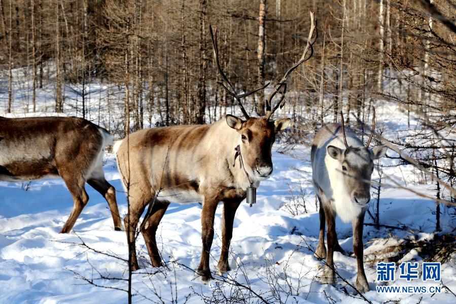 在黑龍江省大興安嶺地區(qū)呼中區(qū)飛虎山5號線,冬日暖陽穿過莽莽林海,投下斑駁光影。伴著清脆的鹿鈴聲,馴鹿群覓食歸來。曹樹權(quán)邊拍著一頭馴鹿,邊給它喂食豆餅,興奮的“小家伙”一直親昵地往他身上蹭。