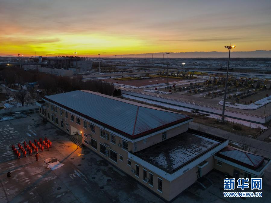 清晨的新疆霍爾果斯壓氣首站,賽依克江·吾龍和工友們在進(jìn)行班前點(diǎn)名(2月4日攝,無人機(jī)照片)。新華社記者 高晗 攝