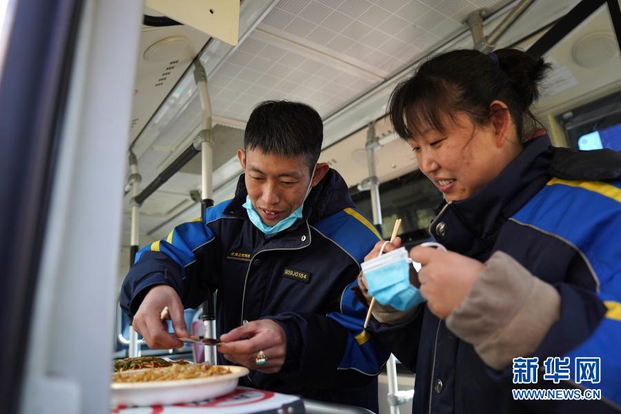 在地鐵建國(guó)門站,姜楠(左)和柴麗莉在公交車上一起吃午飯(2月10日攝)。新華社記者 鞠煥宗 攝