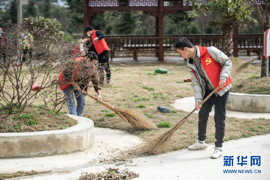 貴州省龍里縣冠山街道五新村志愿者春節(jié)期間打掃廣場(chǎng)。(新華社記者陶亮攝)