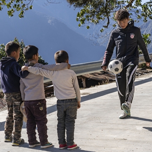在西藏林芝市墨脫縣德興鄉(xiāng)巴登則村,旺前羅布向弟弟們展示自己的球技(2月9日攝)。新華社記者 孫非 攝