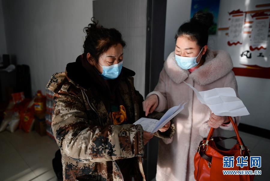趙淑華(左)查看一位社區(qū)居民的核酸檢測(cè)報(bào)告等相關(guān)防疫文件(2月15日攝)。新華社記者 許暢 攝