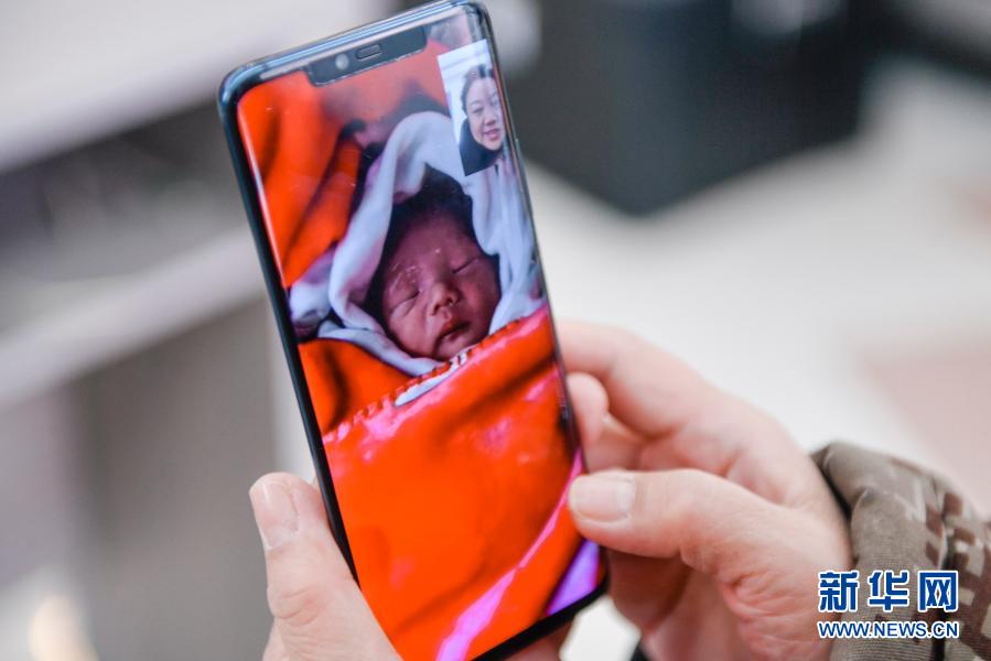 趙淑華與她的兒子、兒媳視頻連線,隔空看到了當(dāng)日出生的孫子(2月16日攝)。新華社記者 許暢 攝