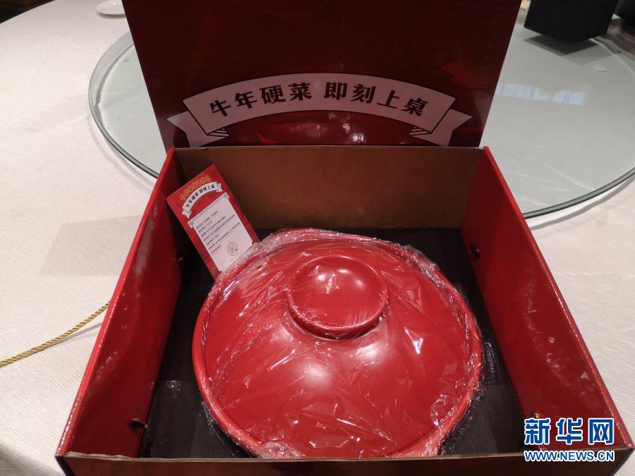 這是2月17日在成都一家中餐廳拍攝的春節(jié)期間推出的半成品“牛年硬菜”干燒海參的包裝禮盒(手機照片)。新華社記者 胡旭 攝