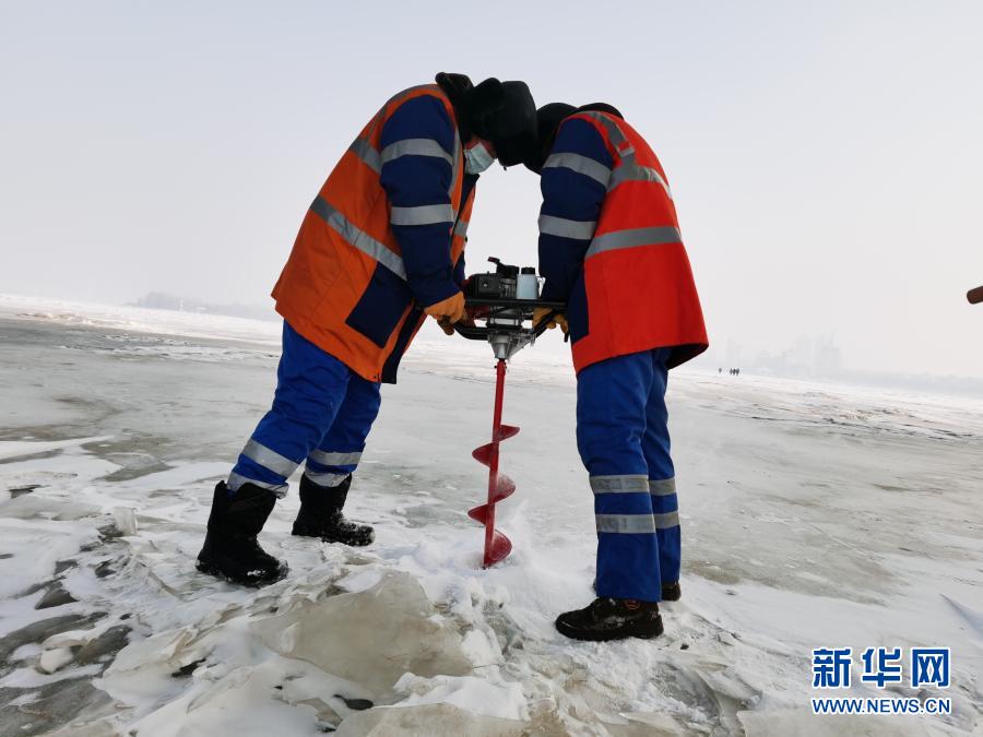 1月13日,中國(guó)鐵路哈爾濱局集團(tuán)有限公司哈爾濱工務(wù)段高鐵路橋車間的橋隧工史慶龍和同事在冰封的松花江面上鉆冰孔。新華社記者 王君寶 攝